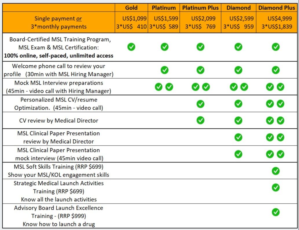 And there is more! We also are the only one that provide personalized MSL coaching by MSL hiring mangers & medical directors (see the pricing table above)